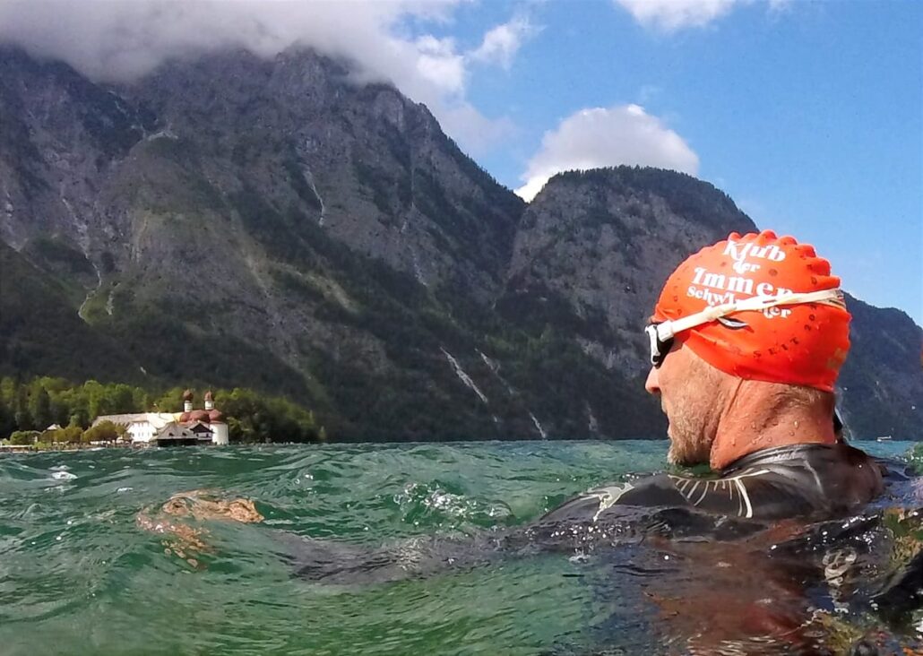 Kurzer Stopp mit Blick auf St. Bartholomä vom Ostufer Mitschwimmer Hermann Spensberger